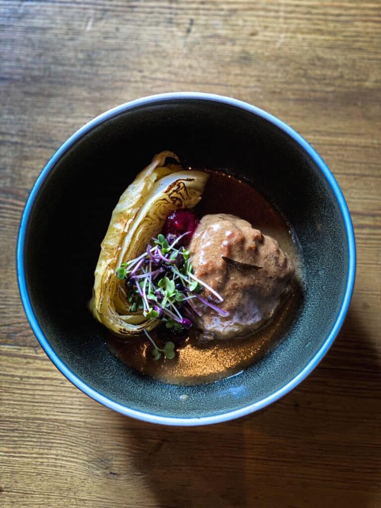 Farsert med brun Geitost og servert med sesongens Grønnsaker, kremet Viltsaus og rørte Tyttebær. For å lage brunost, blander man fløte med myse fra geit- eller kumelk, og koker bort overflødig væske. Resultatet er en unik sødme med et hint av karamell. Denne allsidige osten brukes på det norske matbordet fra frokost til middag, til vafler, knekkebrød og smørbrød. Den er også en viktig ingrediens i ulike retter inkludert viltkjøtt, som vår spesialitet "Bryggens Reinsdyrfilet". (1,7,13)